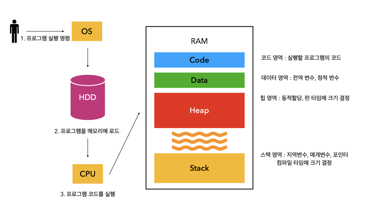 메모리 구조: - 코드(Code) 영역 • 실행할 프로그램의 코드가 저장되는 영역으로 텍스트 영역이라고도 부른다. • 실행 파일을 구성하는 명령어들이 올라가는 메모리 영역으로, 함수, 제어문, 상수 등이 지정된다. • 끝날 때까지 메모리에 남아 있고 CPU는 코드 영역에 저장된 명령어를 하나씩 가져가서 처리한다. - 데이터(Data) 영역 • 프로그램의 전역 변수와 정적 변수가 저장되는 영역이다. • 프로그램의 시작하고 끝날 때까지 메모리게 계속 남아있는다. - 힙(Heap) 영역 • 사용자가 직접 관리할 수 있고 사용자에 의해 메모리 공간이 동적(Dynamic)으로 할당되고 해제된다. • 메모리의 낮은 주소에서 높은 주소의 방향으로 할당되는 선입선출(FIFO) 구조이다. • 동적 할당으로 인해 메모리를 효율적으로 관리할 수 있다. • 런타임 시 크키가 결정된다. - 스택(Stack) 영역 • 함수희 호출과 관계되는 지역변수와 매개변수가 저장되는 영역이다. • 함수의 호출과 함께 할당되며 함수의 호출이 완료되면 소멸한다. • 메모리의 높은 주소부터 낮은 수조의 방향으로 할당되는 후입선출(LIFO) 구조이다. • 컴파일 시 크키가 결정된다.
