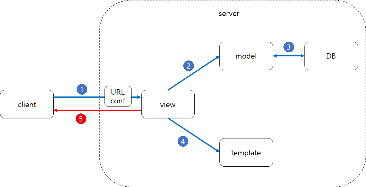 MTV 패턴을 그림으로 정리하면 아래와 같다. 1. 유저가 특정 URL로 요청하면 URLconf을 통해 해당 URL과 매핑된 View 호출 2. 호출된 뷰는 요청에 따라 적절한 로직을 수행, 그 과정에서 Model에 CRUD를 지시 *CRUD: Create(생성), Read(읽기), Update(갱신), Delete(삭제)를 묶어서 일컫는 말 3. Model은 ORM을 통해 DB와 소통하여 CRUD 수행 4. View는 지정된 템플릿을 렌더링 5. 최종 결과를 응답으로 반환