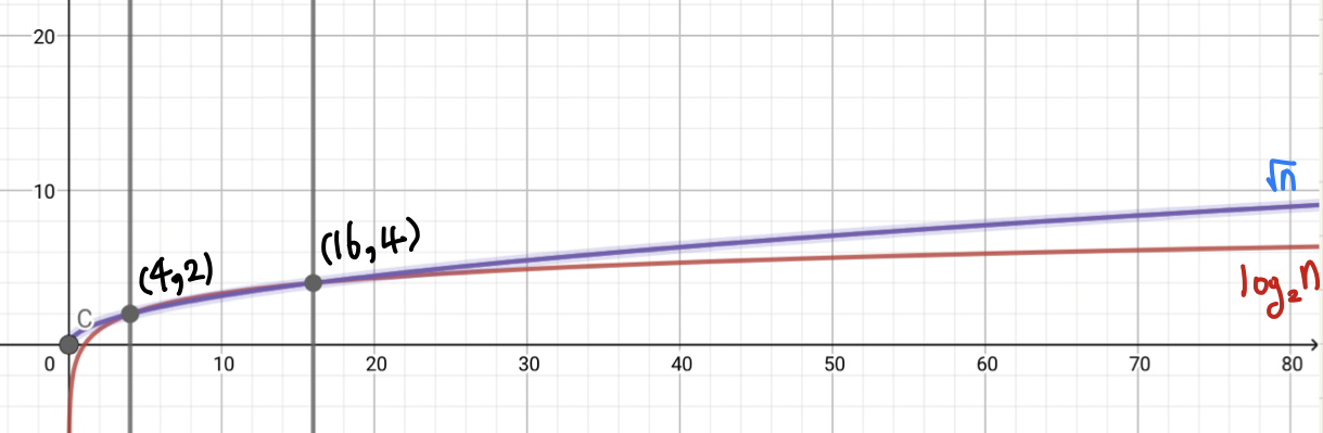 이 방법의 시간 복잡도는 N**0.5개의 숫자만 탐색하기 때문에 O(N**0.5)가 된다. 이것 또한 O(N)에 들어가야 할 범주 같지만 조금이라도 효율적으로 보였다. 아래는 O(logN)의 비교 그래프를 가져와봤다. N이 충분히 큰 값이라면 시간 복잡도는 O(logN)이 O(N**0.5) 보다 효율적이라는 것을 확인할 수 있다.