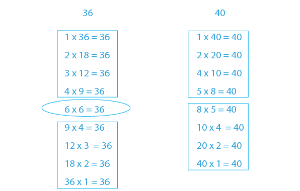 소인수분해를 이용한 방법으론 반복 횟수를 절반이나 줄였음에도 불구하고 시간복잡도의 변화는 없었다. 시간 복잡도를 줄이기 위해 나온 또 다른 방법이 제곱근을 이용한 소수 판별이다. 제곱수인 36과 제곱수가 아닌 수 40의 인수를 보면 아래와 같다.