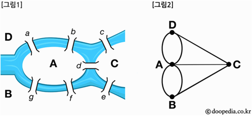 대학시절 공학수학 시간에 날 엄청나게 괴롭혔던 레온하르트 오일러가 이 문제에 대해서 조사, 논문을 작성하게 되는데, 이것이 그래프 이론의 시작이라고 한다.
