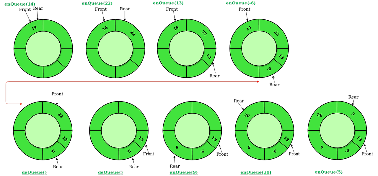- enQueue()를 하면 Rear가 앞으로 이동, deQueue()를 하면 Front가 앞으로 이동한다.