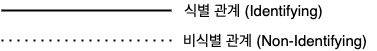 실선은 식별 관계를 나타내고, 점선은 비식별관계를 나타낸다. 식별 관계란 부모 Entity의 기본키를 자식 Entity의 기본키로 사용하는 관계이고, 비식별관계는 부모 Entity의 기본키를 자식 Entity에서 외래키로 사용하는 관계이다. 예를 들어 학생과 성적의 관계는 식별관계, 학생과 과목의 관계는 비식별관계라 볼 수 있다.